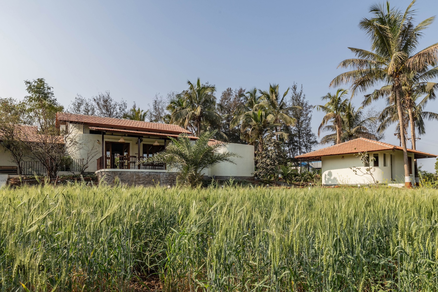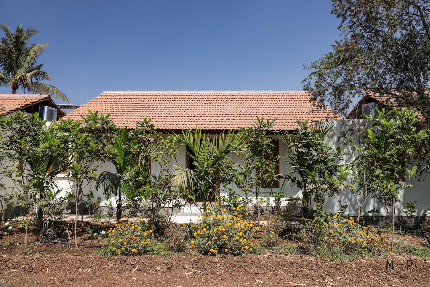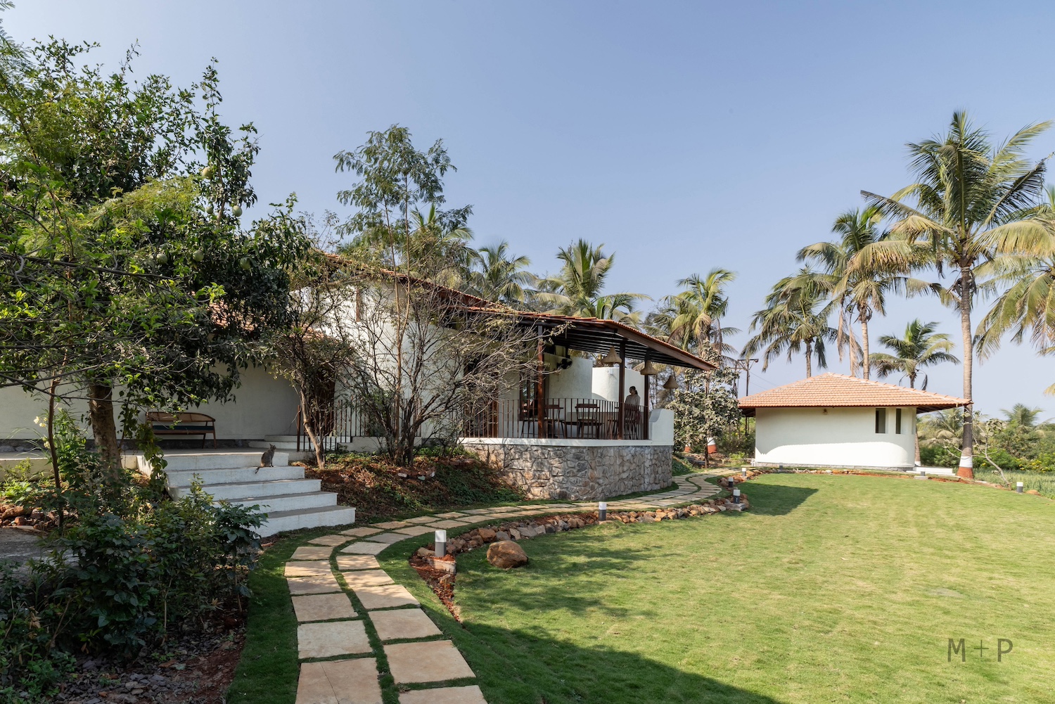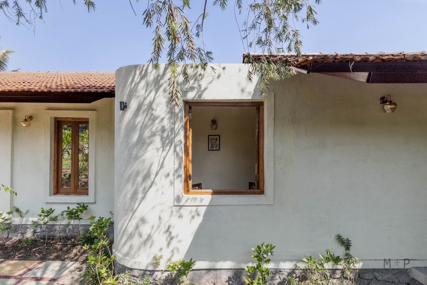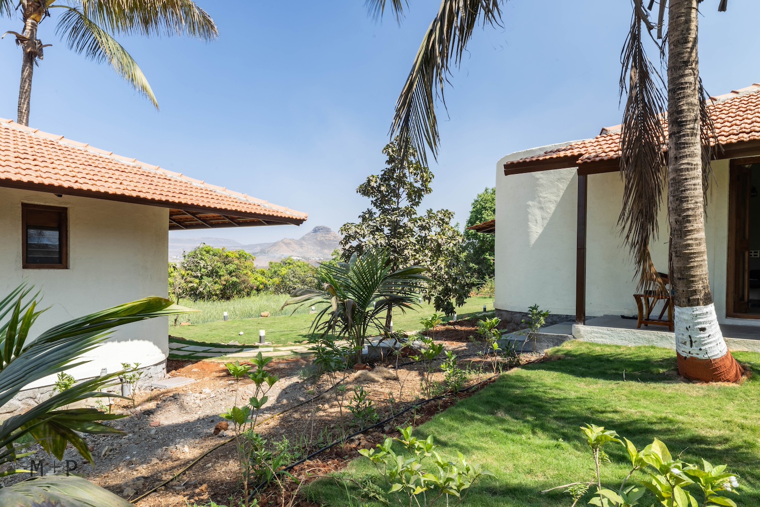 The design was conceived as a sprawling layout, with a central living area and three independent bedrooms, positioned between two bunds to allow for horizontal expansion. The space required a sense of softness, achieved through the building’s curved edges. Low-sloping roofs complemented the natural form of the surrounding hills, creating long, graceful lines that blended seamlessly with the landscape and vegetation. The house is nestled in the fields, with views of the shared lawn, mango orchards, the valley, and distant hills. Initially, they envisioned the structure to be built with earth and wood. However, due to cost and logistical constraints, they opted for more conventional materials like stone, brick, steel, and concrete, while keeping the load-bearing structural system intact. The curved outlines of the building were carefully marked on-site, and the stone foundation, made of black basalt random rubble masonry, was completed by July of the same year.