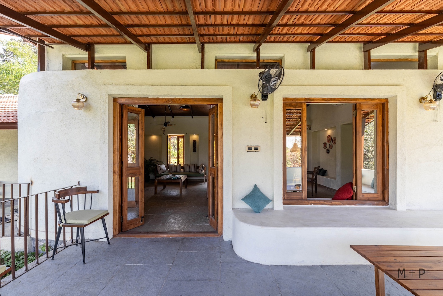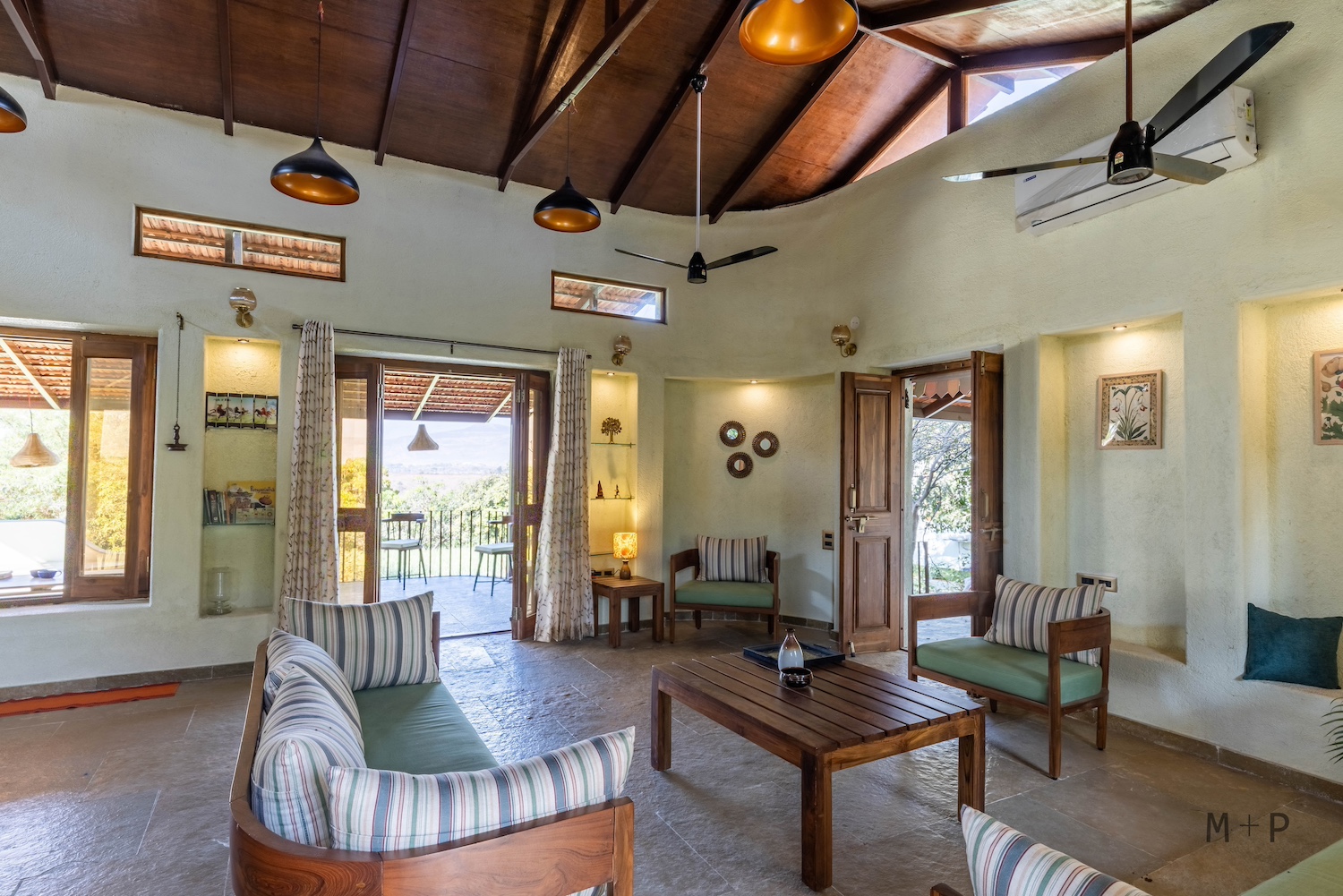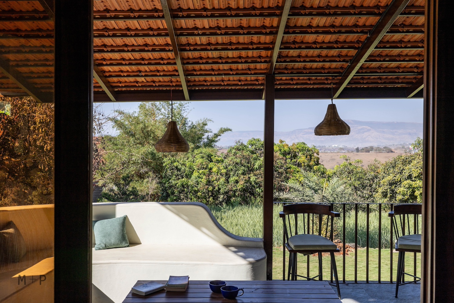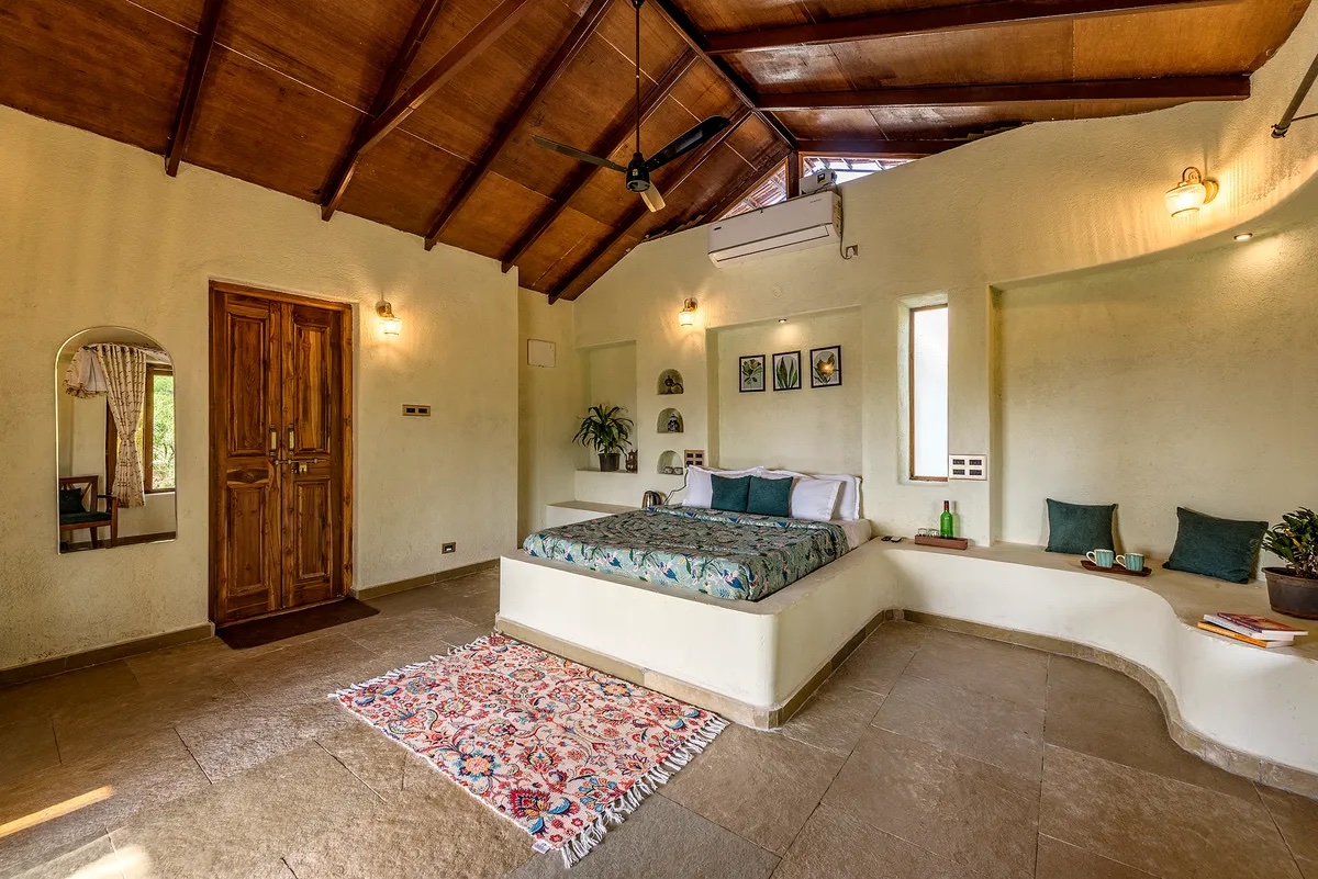 Solid wood and glass were used for the windows and doors. The bedrooms were designed with built-in beds and seating, providing ample lounging space. The living area, with its higher ceiling, was designed to accommodate multiple seating arrangements, allowing for flexibility in furniture placement. This space opens onto a 10-foot deep verandah, offering sweeping views of the mango orchard, valley, and hills beyond.