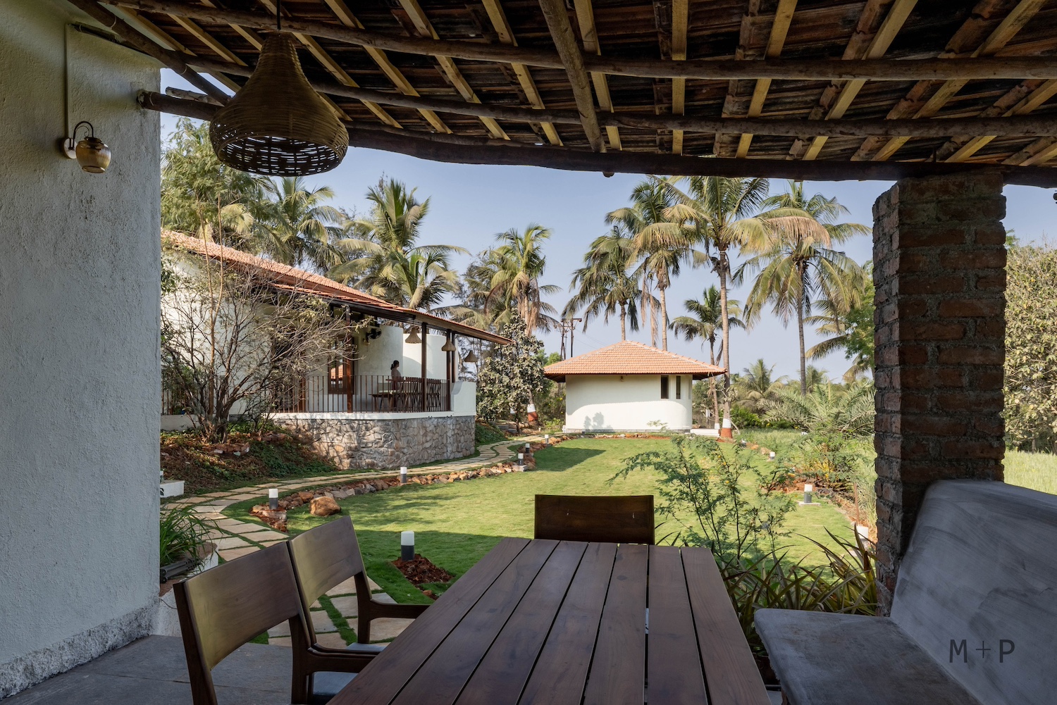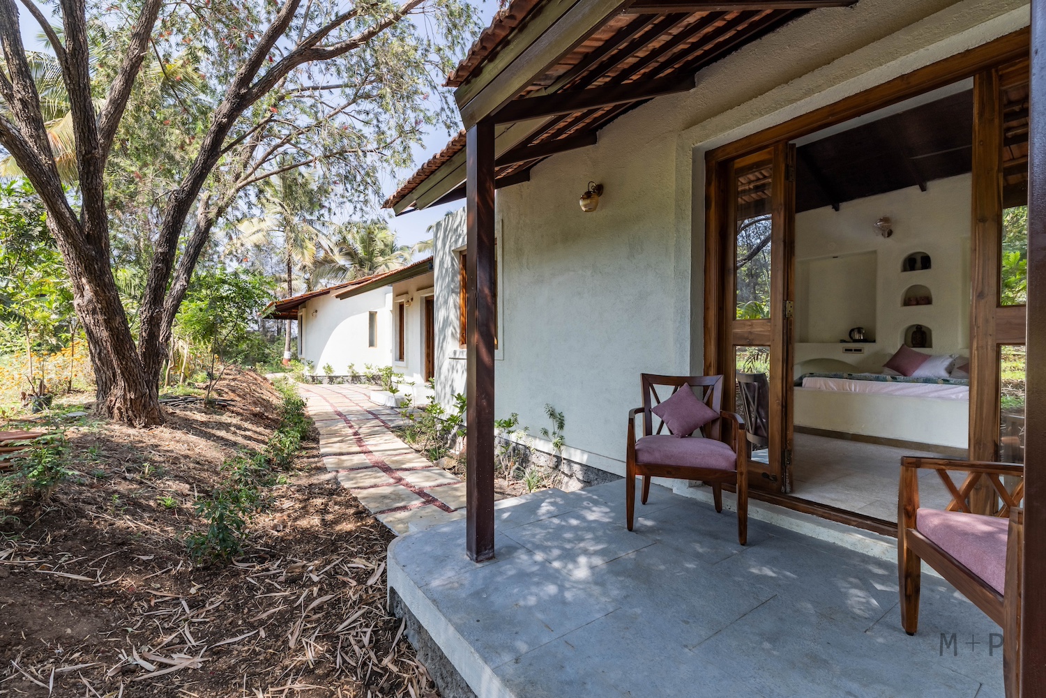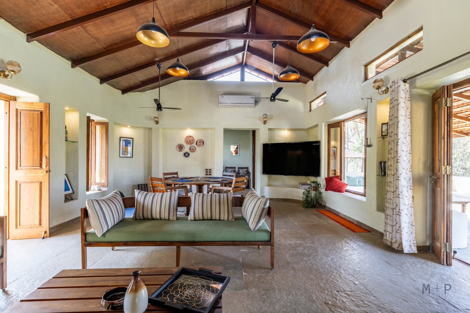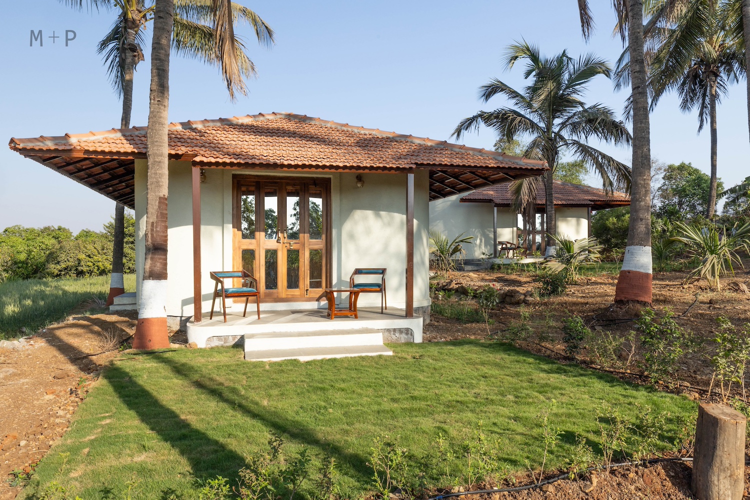 Solid wood and glass were used for the windows and doors. The bedrooms were designed with built-in beds and seating, providing ample lounging space. The living area, with its higher ceiling, was designed to accommodate multiple seating arrangements, allowing for flexibility in furniture placement. This space opens onto a 10-foot deep verandah, offering sweeping views of the mango orchard, valley, and hills beyond.