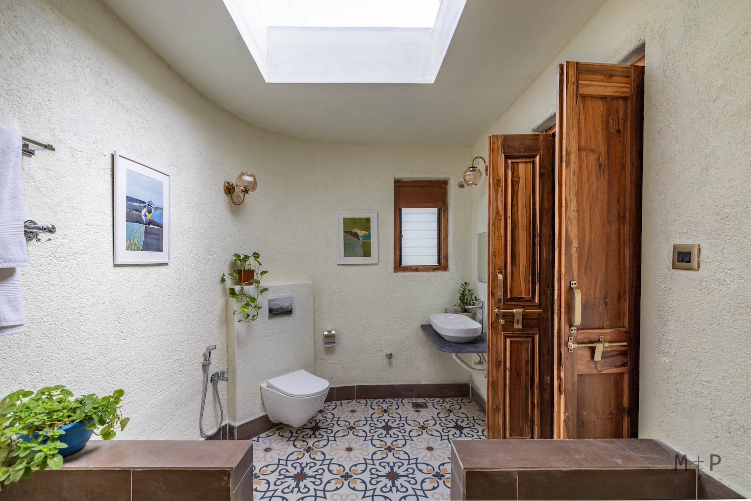 The original plan for Joshet called for 18-inch cob walls, but this change in materials offered an opportunity to explore niches, voids, and openings in the brickwork. A ring beam was cast atop the load-bearing masonry, acting as a lintel and providing a secure base with embedded anchors for the fabricated roof structure. Generous roof overhangs, extending 4 feet over the curved walls, give the building a grounded, accessible feel, while also protecting the structure from the elements. Large bathrooms with skylights were designed to bring in ample daylight, and open-to-sky ducts in the toilets ensured proper ventilation, helping to maintain a dry, hygienic environment. Low, flat roofs above the bathrooms accommodate services like AC outdoor units and ventilators, as well as creating space for upper level windows in the bedrooms and living areas, inviting more natural light into the interior.